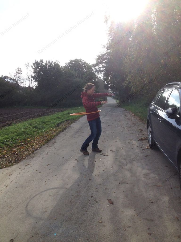 Hula Hoop: Reiter mußten möglichst zügig auf dem Sattel durch den Reifen steigen.